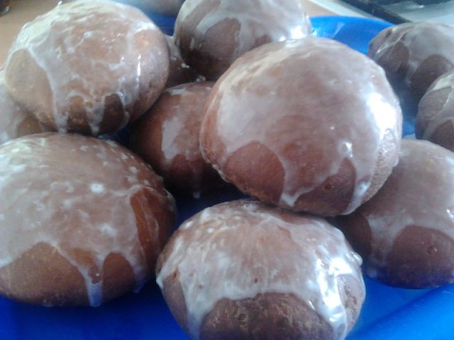 Połowe mleka podgrzać z cukrem. Dodać drożdże i rozpuścic. Mąkę przesiać do miski, zrobic wgłębienie wlac mleko z drożdżami wymieszać z odrobiną mąki. Odstawić na 15 minut w ciepłe miejsce. Reszte mleka podgrzać i dodać do zaczynu z jajkami, solą margaryną i olejkiem. Odstwić do wyrośnięcia. Wycinać kółka o grubości 1 cm nałożyć marmoladę i odstawić w ciepłe miejsce aby troche wygarowały. Wrzucić na rozgrzany tłuszcz piec 4-5 minut na złocisty kolor. Polac lukrem