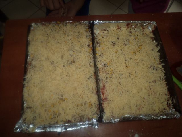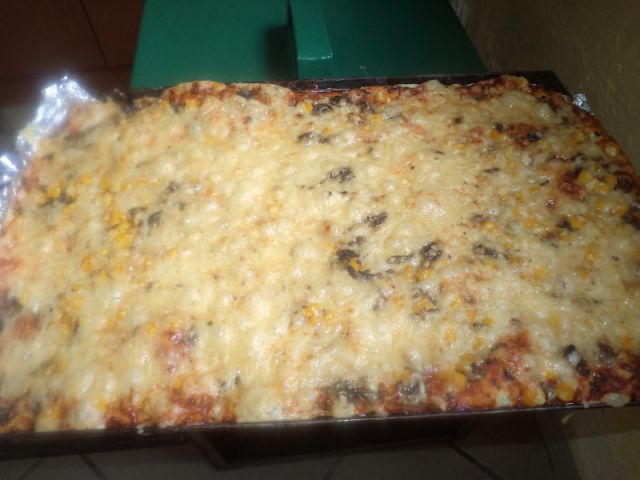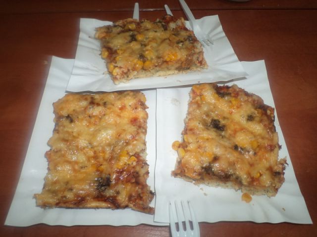 Ciasta wychodzi na dwie okrągłe blaszki o średnicy 18 cm. Ciasto rozwałkować, ponakłuwać widelcem. Składniki na pizze według upodobania nasza propozycja: sos pomidorowy, starte na grubych oczkach pieczarki, kukurydza, żółty ser i przyprawy bazylia, zioła prowansalskie.